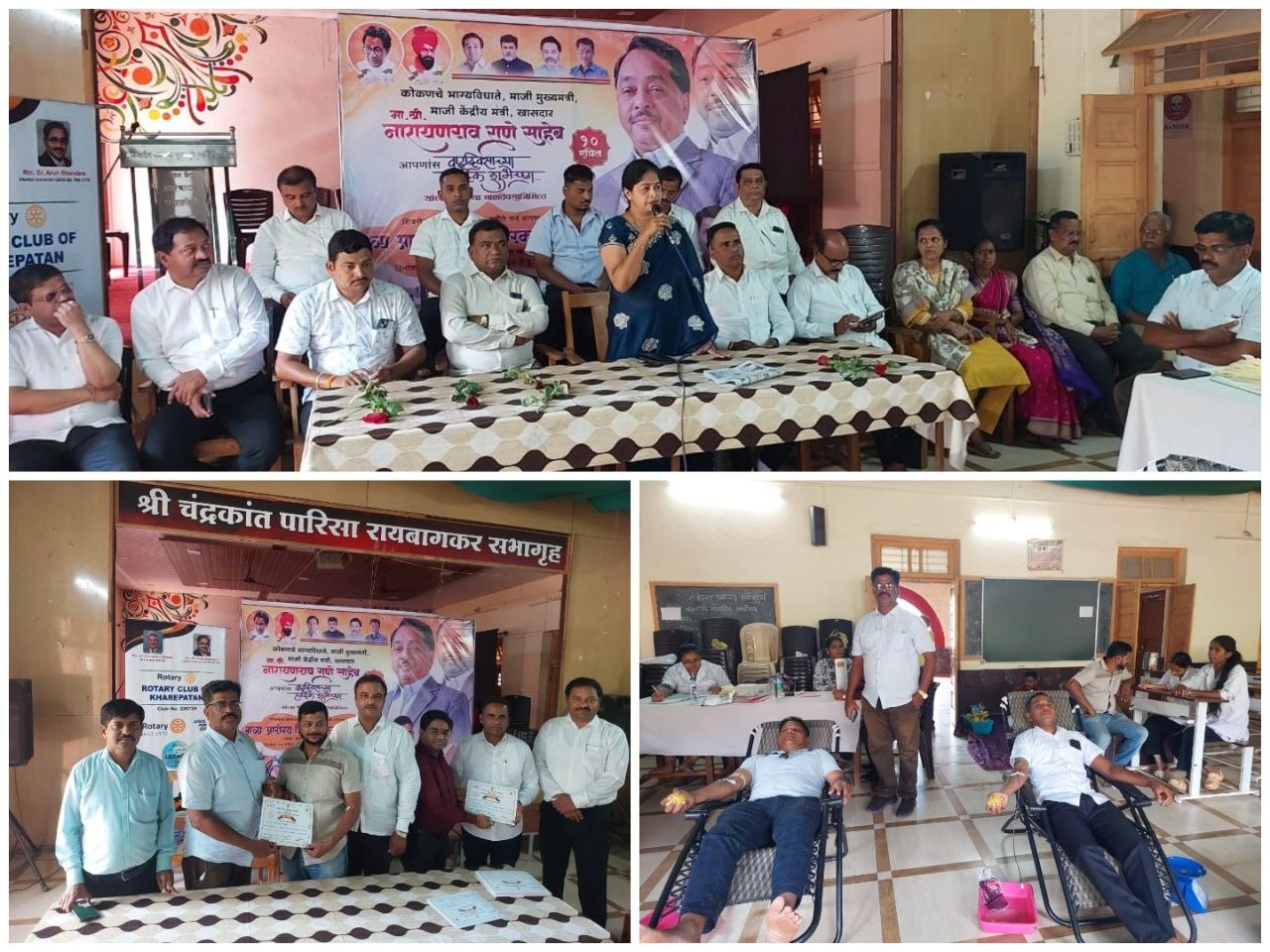 खारेपाटण (प्रतिनिधी) : महाराष्ट्र राज्याचे माजी मुख्यमंत्री व माजी केंद्रीय मंत्री विद्यमान खासदार नारायणराव राणे यांच्या अमृत महोत्सवी वाढदिवसानिमित्त शिवसेना शिंदे पक्ष खारेपाटण विभाग व रोटरी क्लब ऑफ खारेपाटण यांच्या संयुक्त विद्यमाने खारेपाटण येथील शेठ न. म. विद्यालय येथे नुकतेच भव्य आरोग्य व रक्तदान शिबिर कार्यक्रम जि. प. सदस्य प्राची ईसवलकर व पं. स. सदस्य गुरुप्रसाद शिंदे यांच्या प्रमुख उपस्थित संपन्न संपन्न झाला. या कार्यक्रमाला शिवसेना कणकवली तालुका प्रमुख मंगेश गुरव, खारेपाटण सरपंच महेंद्र गुरव, भाजपा पक्षाचे ज्येष्ठ कार्यकर्ते व माजीं सरपंच महेंद्र गुरव, खारेपाटण पंचक्रोशी शिक्षण प्रसारक मंडळाचे अध्यक्ष प्रवीण लोकरे, रोटरी क्लब ऑफ खारेपाटण चे अध्यक्ष दयानंद कोकाटे, खारेपाटण हायस्कूल प्राचार्य संजय सानप, खारेपाटण सोसायटीचे संचालक विजय देसाई, इस्माईल मुकादम, खारेपाटण ग्रा.पं सदस्य मनाली होणाळे, दक्षता सुतार, सुधाकर ढेकणे, जयदीप देसाई, किरण कर्ले, संस्थेचे संचालक प्रशांत गुळेकर, युवा कार्यकर्ते तेजस राऊत, सुहास राऊत, माजी ग्रा. पं. सदस्य योगेश पाटणकर, रोटरी सदस्य अजय गुरसाळे, संतोष राऊत, पप्पू रायबागकर, सिंधू मित्र रक्त प्रतिष्ठान चे कार्यकर्ते दादा जाधव, आदी मान्यवर यावेळी उपस्थित होते.
